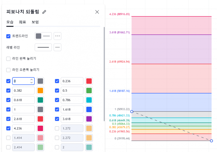 2. 선택한 구간의 시작점과 끝점을 기준으로 피보나치 비율에 해당하는 선을 그립니다. 이 선들은 피보나치 리트레이스먼트 또는 피보나치 익스텐션이라고 부릅니다.