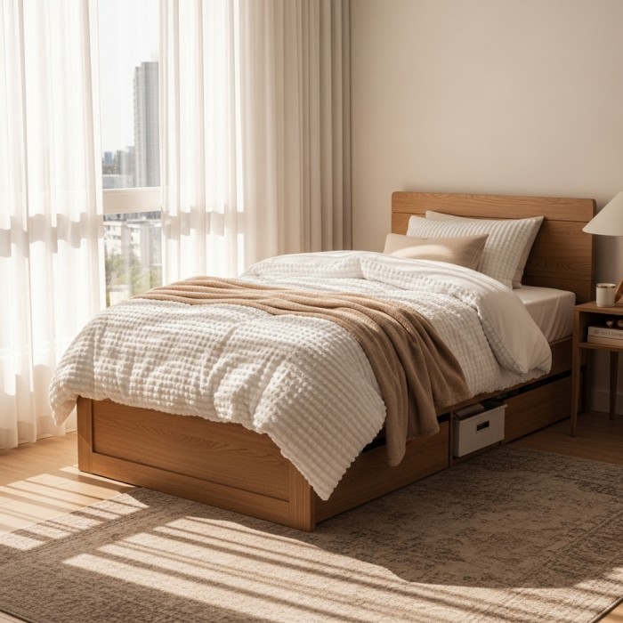 선택의 여지가 없습니다. 무조건 슈퍼싱글입니다. 이때 중요한 것은 '수납형 프레임'을 선택하는 것입니다. 침대 하단에 서랍이 있거나 매트리스를 들어 올려 짐을 넣는 '벙커형' 프레임을 쓰면, 옷장 하나를 들이는 효과를 볼 수 있습니다. 벽 쪽에 침대를 붙여 소파처럼 활용하는 것도 팁입니다.