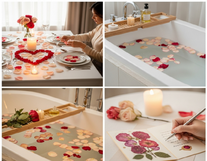 특별한 날, 장미 꽃잎을 활용하여 로맨틱한 분위기를 연출해 보세요. 침대 위나 욕조, 식탁 위에 장미 꽃잎을 흩뿌려 놓는 것만으로도 영화 속 한 장면 같은 분위기를 만들 수 있습니다. 향초나 은은한 조명과 함께라면 금상첨화겠죠? 특별한 이벤트나 프로포즈를 계획하고 있다면 강력 추천하는 방법입니다.