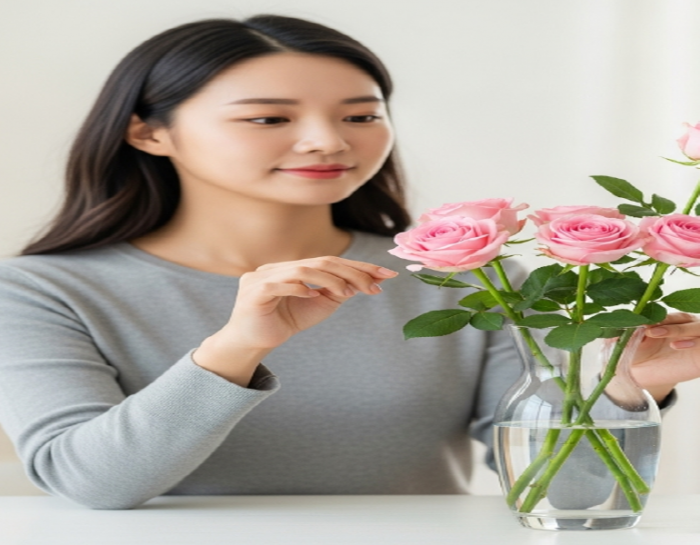 - 줄기 자르기: 물에 꽂기 전, 장미 줄기 끝을 물속에서 사선으로 1~2cm 정도 잘라주면 물 흡수율이 높아져 더 오래 싱싱함을 유지할 수 있습니다.