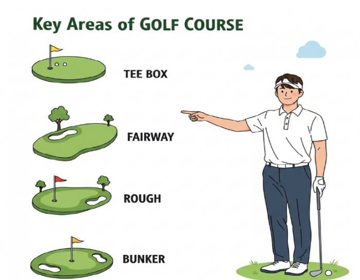 - 러프(Rough): 페어웨이 양옆의 잔디가 긴 구역. 공을 치기 어렵습니다.