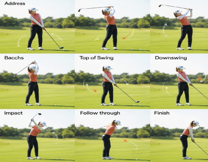 - 피니시(Finish): 스윙의 마무리 동작으로, 몸의 균형을 잡고 안정적인 자세를 유지합니다. 체중은 왼발에 완전히 실려 있어야 합니다.