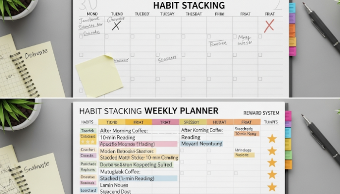 - 습관 쌓기(Habit Stacking): 새로운 습관을 이미 매일 하고 있는 기존 습관에 덧붙이는 방법입니다. 예를 들어, "양치질 후 바로 스쿼트 10개 하기", "커피를 내리는 동안 설거지하기"처럼 자연스럽게 연결하면 성공 확률이 높아집니다.