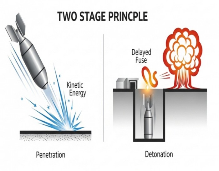 벙커버스터의 원리는 크게 두 단계로 나눌 수 있습니다. 바로 **①목표 지점까지 땅과 콘크리트를 뚫고 들어가는 '관통' 단계**와, **②목표 지점에 도달한 후 폭발하는 '지연 폭발' 단계**입니다.