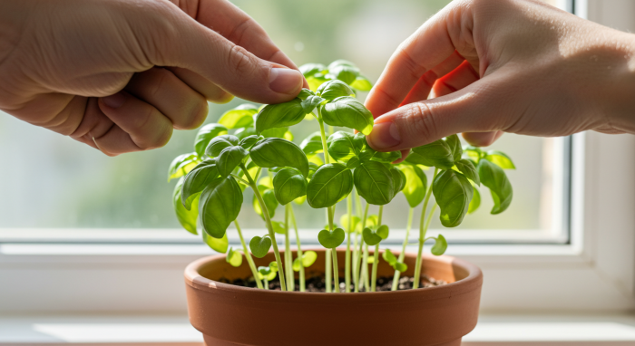 바질을 풍성하게 키우는 가장 중요한 기술, 바로 '가지치기' 또는 '순지르기'입니다. 바질은 위로만 계속 자라게 두면 키만 멀대처럼 크고 잎이 몇 장 달리지 않습니다. 하지만 생장점을 잘라주면, 그 아래 곁가지들이 Y자 모양으로 풍성하게 자라나 수확량을 2배, 4배, 8배로 늘릴 수 있습니다.