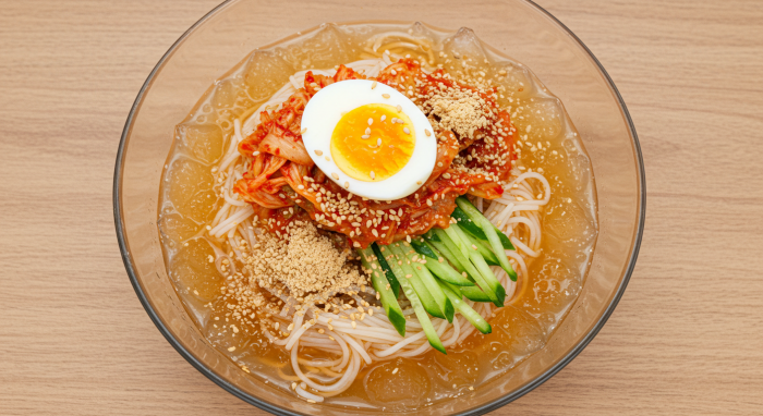 - 완성하기: 소면 위에 육수를 붓고, 양념한 김치, 채 썬 오이, 삶은 계란을 올린 뒤, 마지막으로 깨를 듬뿍 갈아 뿌리면 완성.