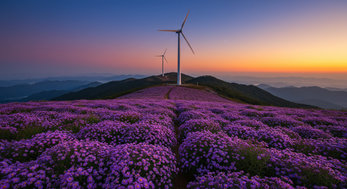 가을 감악산의 주인공은 단연 '아스터 국화'입니다. 정상 풍력발전기 아래 펼쳐진 광활한 언덕이 온통 짙은 보라색 국화로 뒤덮여, 마치 동화 속에 들어온 듯한 비현실적인 풍경을 자아냅니다. 은빛으로 빛나는 억새밭과 어우러져 최고의 인생 사진을 남길 수 있습니다.