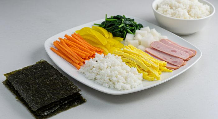 - 김: 김밥용 김은 일반 구이용 김보다 두껍고 질겨서 잘 찢어지지 않는 것이 특징입니다.
