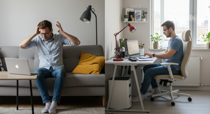 - 출근 의식: 기상 후 샤워하고, 잠옷이 아닌 외출복으로 갈아입고, 집 주변을 15분 산책한 뒤 책상에 앉으세요.