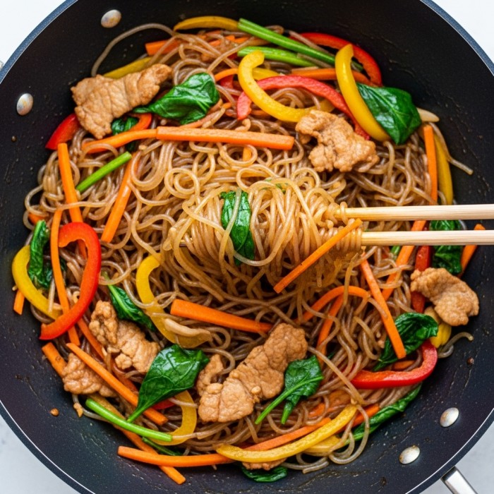고기가 익고 채소가 어느 정도 숨이 죽으면, 불려둔 당면을 넣고 양념이 잘 배도록 저어가며 졸여줍니다. 당면이 양념을 흡수하며 투명하게 익고 국물이 거의 다 졸아들 때까지 볶아주세요. (약 5~7분) - 3단계: 부드러운 채소 넣고 마무리