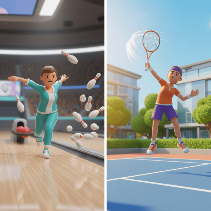 가장 직관적인 종목은 단연 볼링입니다. 조이콘을 휘두르는 속도와 손목의 비틀기만으로 스핀을 조절할 수 있어 남녀노소 누구나 5분이면 적응할 수 있어요. 테니스 역시 타이밍 싸움이 주가 되기 때문에 복잡한 조작 없이도 랠리의 즐거움을 느낄 수 있죠. 특히 테니스는 캐릭터 이동이 자동으로 이루어지므로 스윙 타이밍에만 집중하면 됩니다.